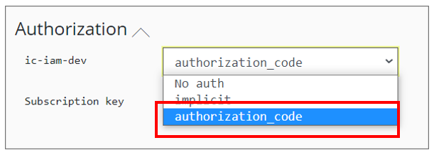 Step 4: After you click on "try it", the below screen will show. Click on ic-iam-dev drop-downlist and select " authorization_code" as show below