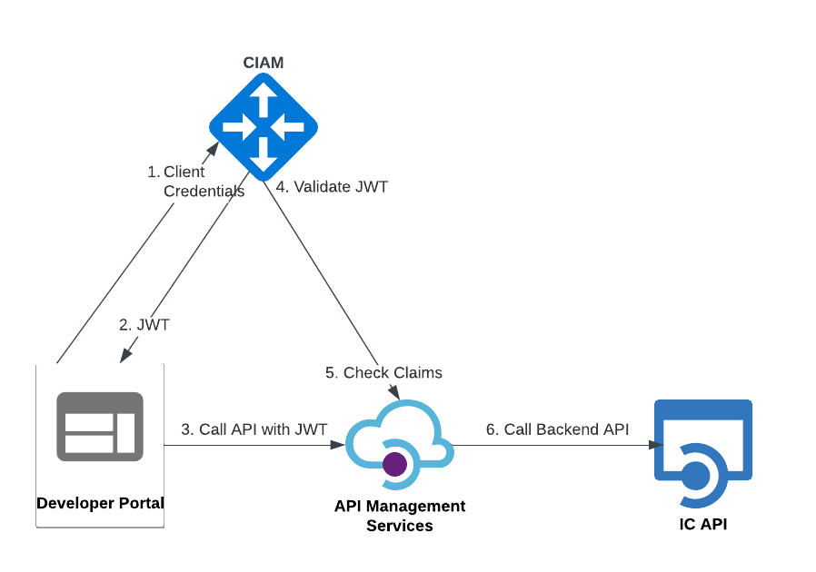 During request initiation, The Developer Portal will requests a token from our CIAM using app registration client id and client secret.